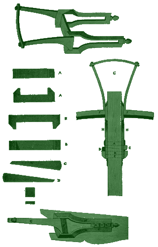 E - пустое место (оставлялось на случай более толстого лука), F - лук, G - стремя, H - петли. |